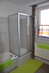 Wohnung 3 ist eine Familienwohnung und 100 qm groß aber auch für 2 Paare geeignet, da das Bad von beiden Schlafzimmern aus zu begehen ist – ohne das andere Paar zu stören.Von der Wohnküche aus erreicht man den kleinen Garten ( Alleinnutzung ! ) mit Sitzecke und Grill, kann den Kräutergarten nutzen und den Schatten unter dem Apfelbaum geniessen…..